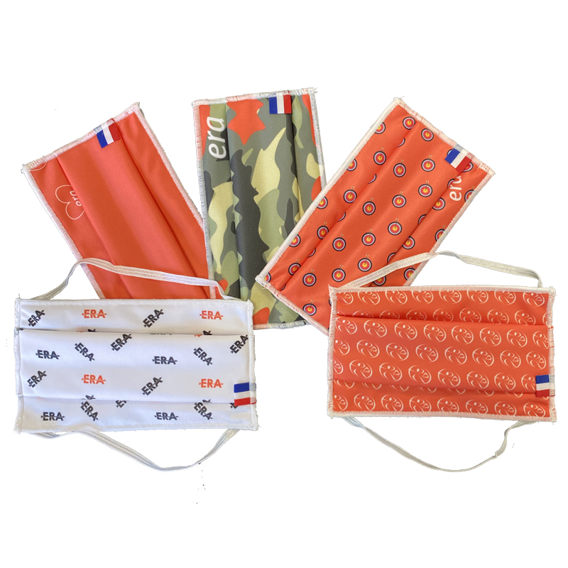 Vous retrouverez dans le gamme ERA 5 lots de masques caractérisés par 5 motifs de 5 couleurs différentes. Vous trouverez dans chaque lot : un motif Logo ERA, un motif écriture ERA, un motif cible, un motif camouflage et un motif ERA coeur. Couleurs disponible : bleu, gris, noir, orange et rose.