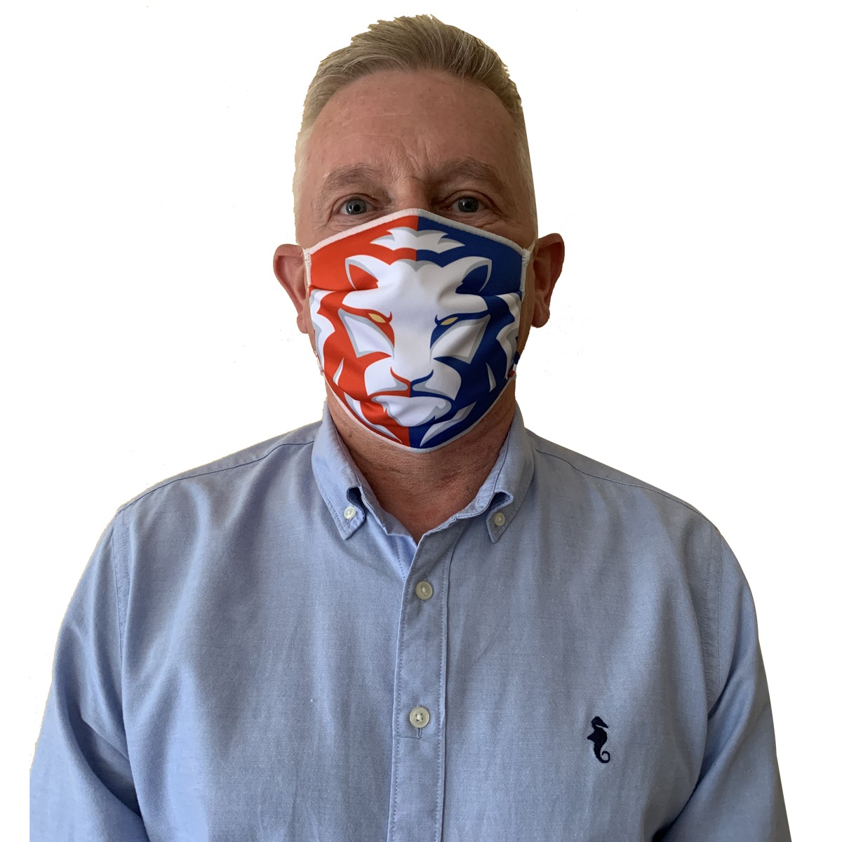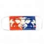 Masque Lion Rouge et Bleu de conception et fabrication 100% française. Filtration garantie 50 lavages. Testé pour 60 lavages. Attache élastique derrière les oreilles.