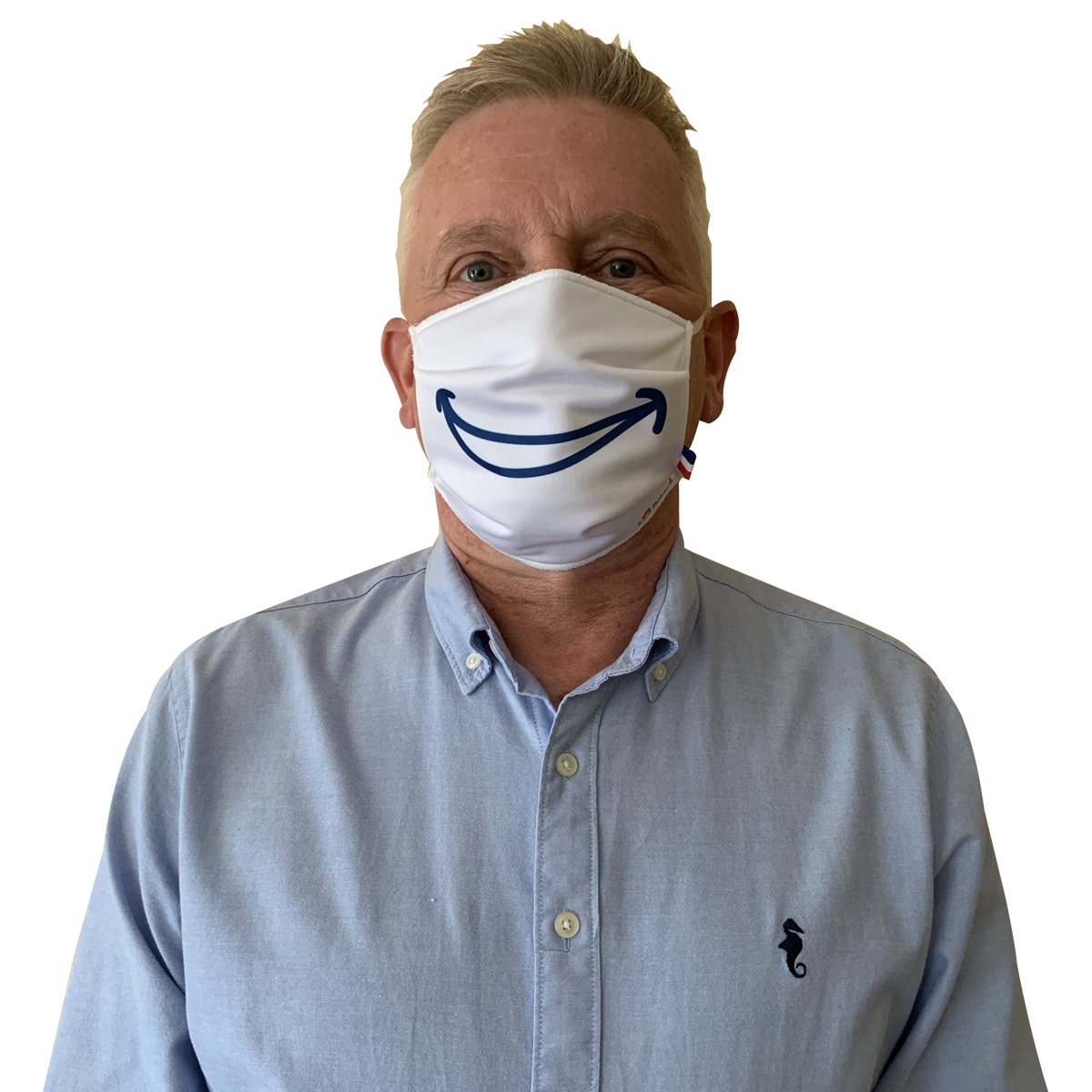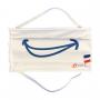 Masque Sourire de conception et fabrication 100% française. Filtration garantie 50 lavages. Attache élastique derrière la tête.